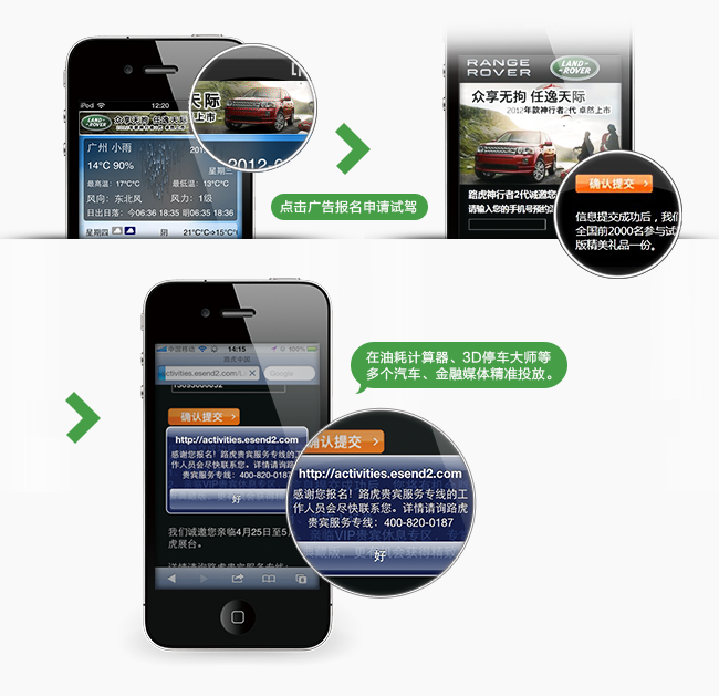 1、通过智能终端在线上寻找目标人群,充分迎合用户“发现”机制,激活用户简单了解相关信息之后的参与兴趣,最终引导用户进行简易的直达操作(提交手机号)报名参与线下赏车及试驾活动。
