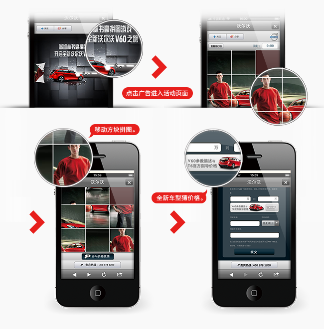 动动手指就有惊喜:V60营销页面为受众设计众多参与环节,HTML5元素凸显智能终端出众的交互功能——划开屏幕、拼图游戏、竞猜价格…新车型展现也能别出心裁!